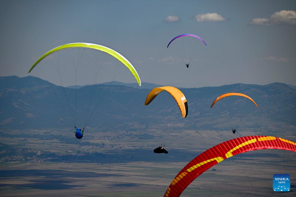 Pilots fly their paragliders during the 2022 Paragliding World Cup in Krushevo, North Macedonia, on July 20, 2022. The event is held here from July 14 to 21, 2022. (Photo by Tomislav Georgiev/Xinhua)