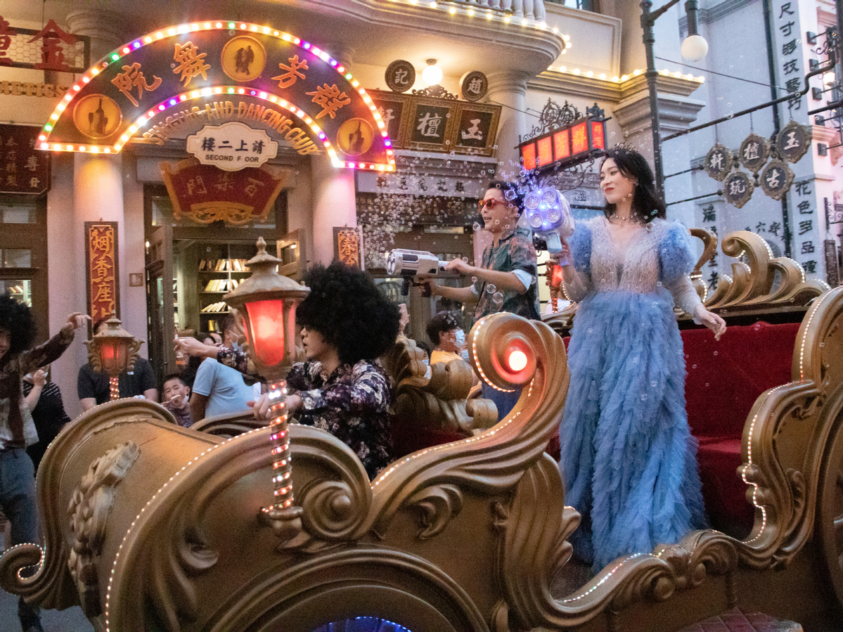 People on a carriage put on a performance at a film town in Zhongmu county of Zhengzhou, Henan province on July 18. [Photo/Xinhua]