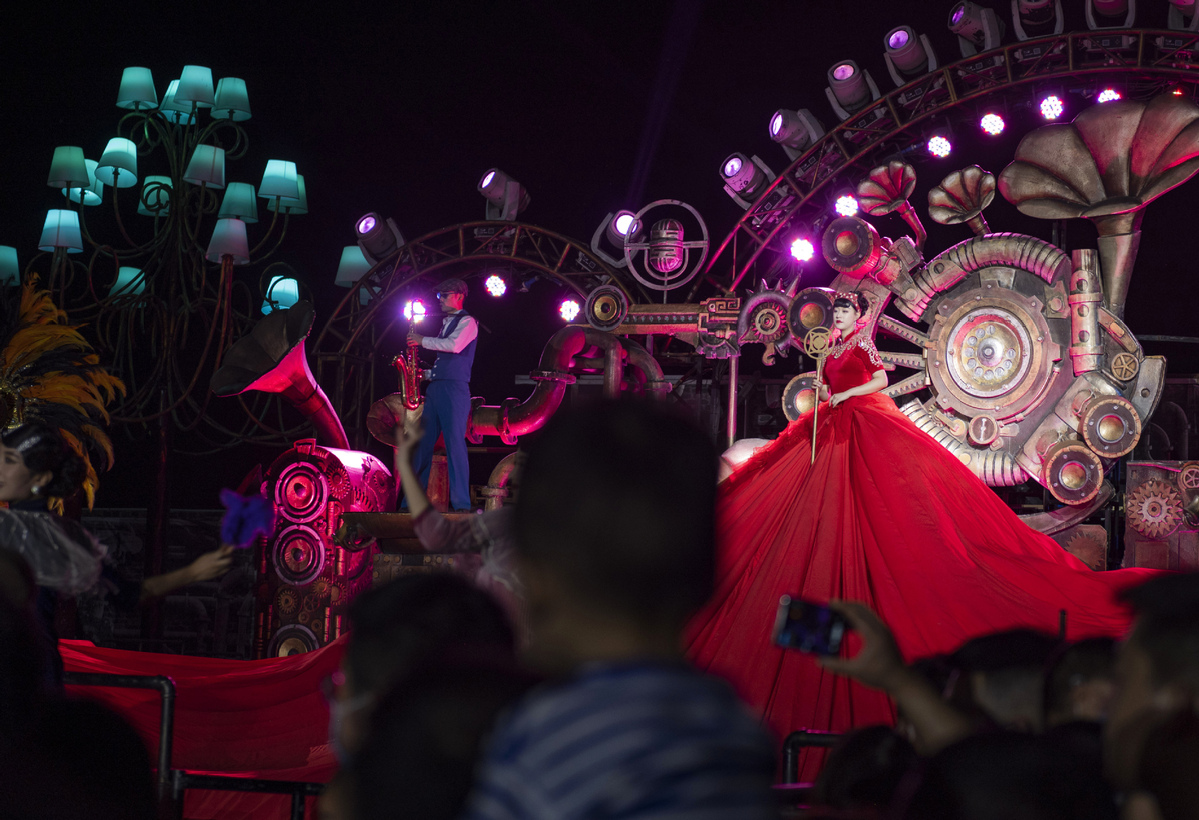 Tourists watch performances at a film town in Zhongmu county of Zhengzhou, Henan province on July 18. [Photo/Xinhua]