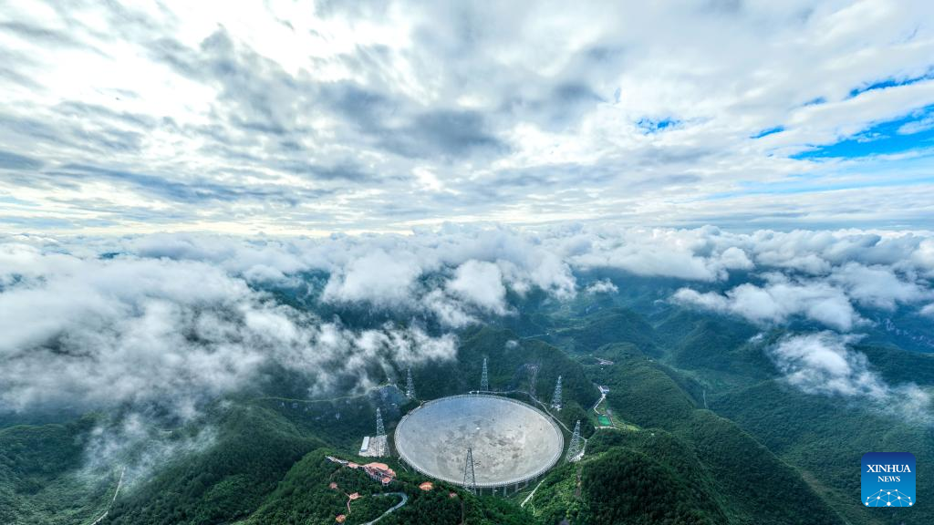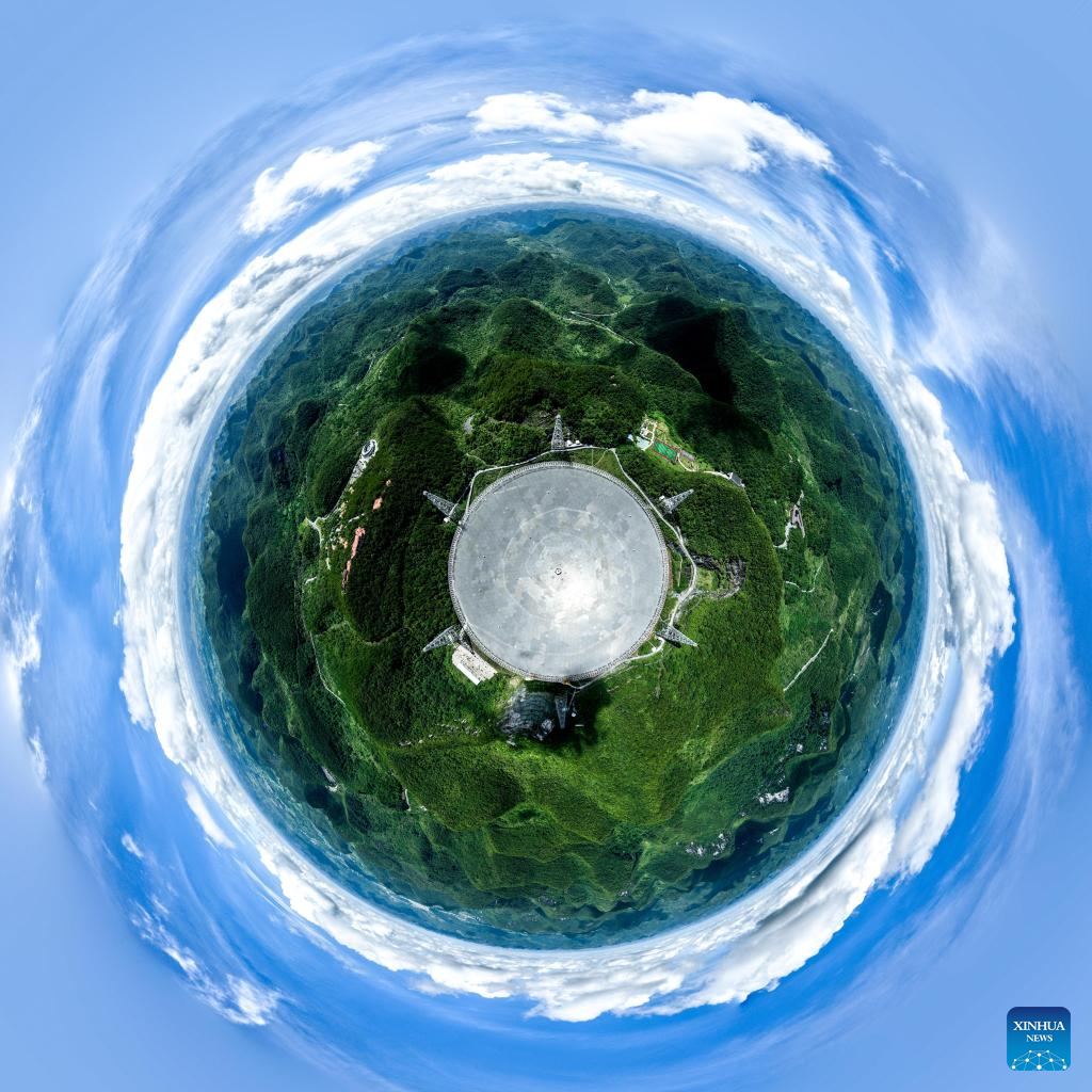 Aerial panoramic photo taken on July 21, 2022 shows China's Five-hundred-meter Aperture Spherical Radio Telescope (FAST) under maintenance in southwest China's Guizhou Province. Using FAST, also dubbed as the "China Sky Eye," scientists have identified over 660 new pulsars since October 2017. (Xinhua/Ou Dongqu)