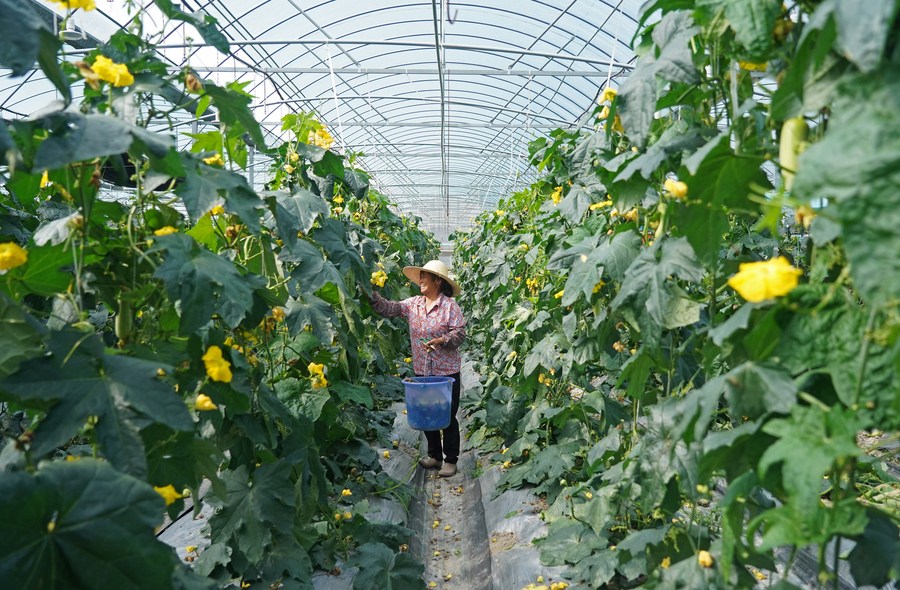 A villager works in a vegetable greenhouse in Tantou Village of Ganzhou, east China's Jiangxi Province, April 29, 2021. (Xinhua/Wan Xiang)
