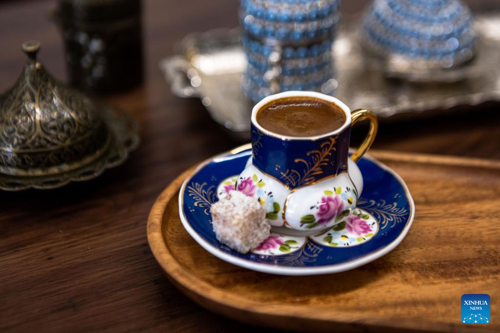 Photo taken on July 11, 2022 shows a set of traditional Turkish coffee at Tulip Turkish Cafe Bar in Kunming, southwest China's Yunnan Province. (Xinhua/Cao Mengyao)
