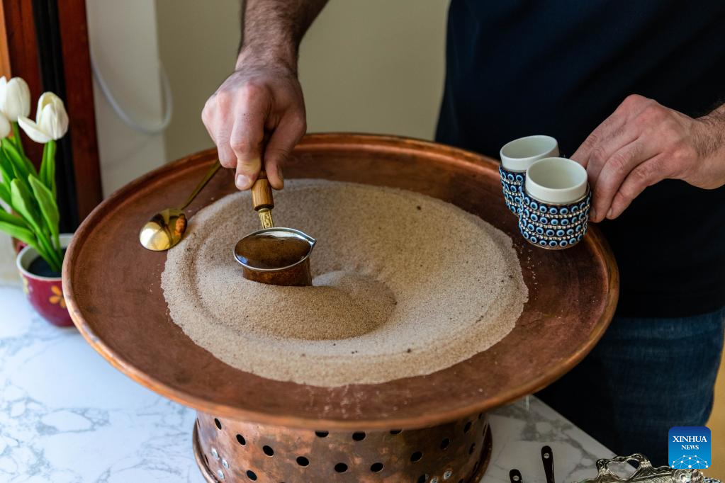 Mikail Tosun makes traditional Turkish coffee at Tulip Turkish Cafe Bar in Kunming, southwest China's Yunnan Province, July 11, 2022. (Xinhua/Cao Mengyao)