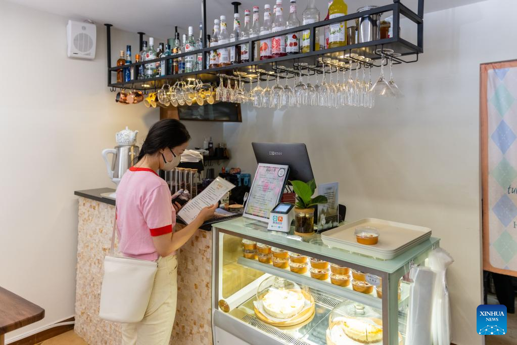 A customer orders at Tulip Turkish Cafe Bar in Kunming, southwest China's Yunnan Province, July 11, 2022. (Xinhua/Cao Mengyao)