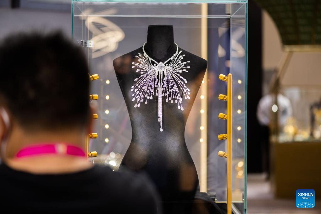 Photo taken on July 26, 2022 shows a piece of jewelry displayed at the second China International Consumer Products Expo (CICPE) in Haikou, south China's Hainan Province. The six-day expo, which kicked off on Monday in Haikou, has attracted 1,107 overseas companies and 1,643 brands from 61 countries and regions, as well as over 1,200 domestic brands.