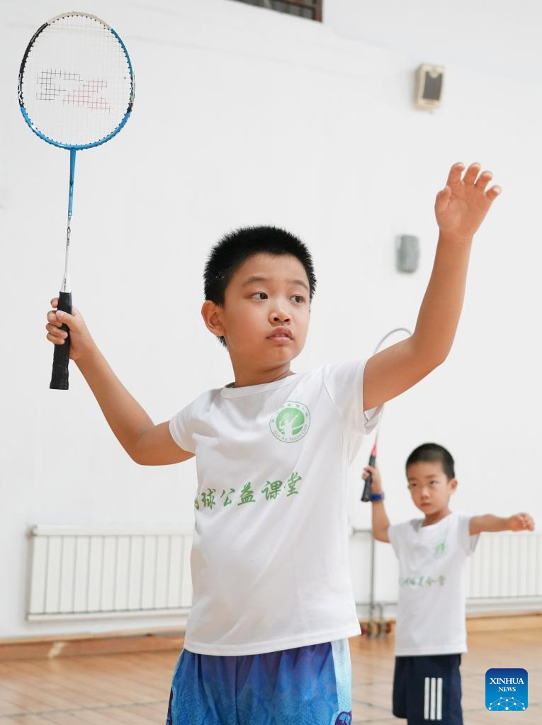 A boy plays badminton as a part of a summer camp program at the National Olympic Sports Center in Beijing, capital of China, July 26, 2022. (Xinhua/Ren Chao)