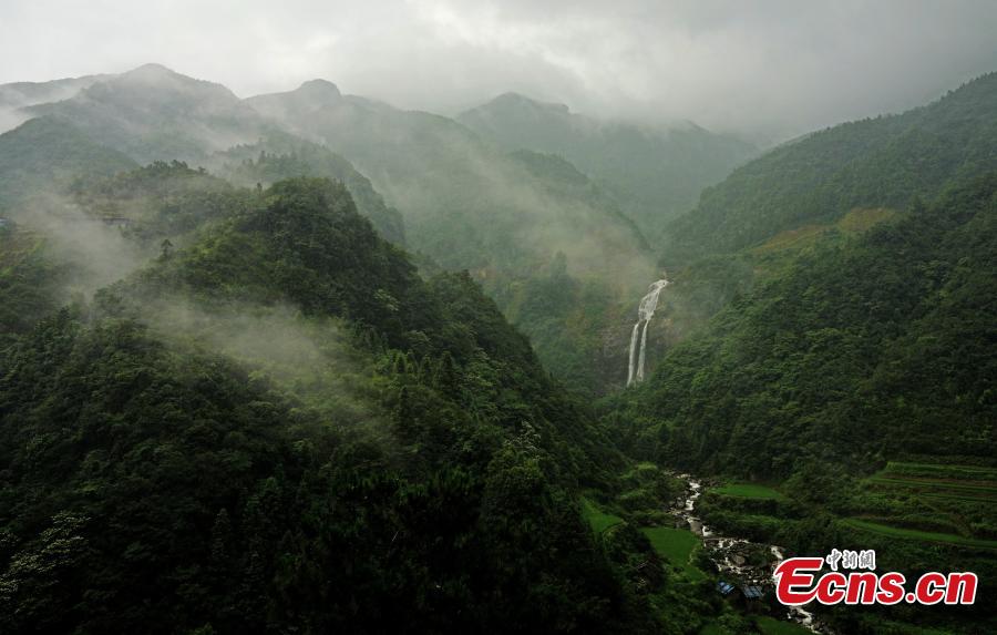 Aerial view of the Yuanbao mountain National Nature Reserve in Rongshui Miao autonomous county of Liuzhou city, south China's Guangxi Zhuang Autonomous Region, July 31, 2022. (Photo provided to China News Service)