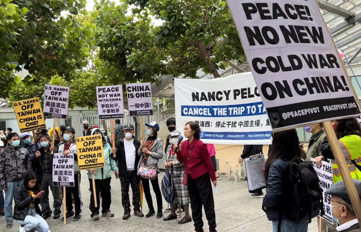 Activists from Pivot to Peace, ANSWER Coalition, CODEPINK, Veterans for Peace and leaders of the Chinese community in San Francisco hold a demonstration in front of US House Speaker Nancy Pelosi's office at the San Francisco Federal Building on Monday. LIA ZHU/CHINA DAILY