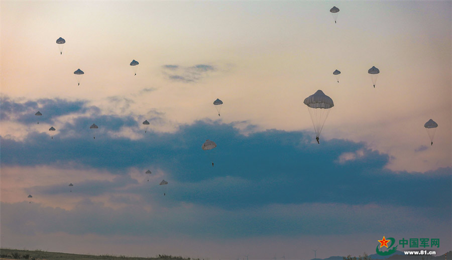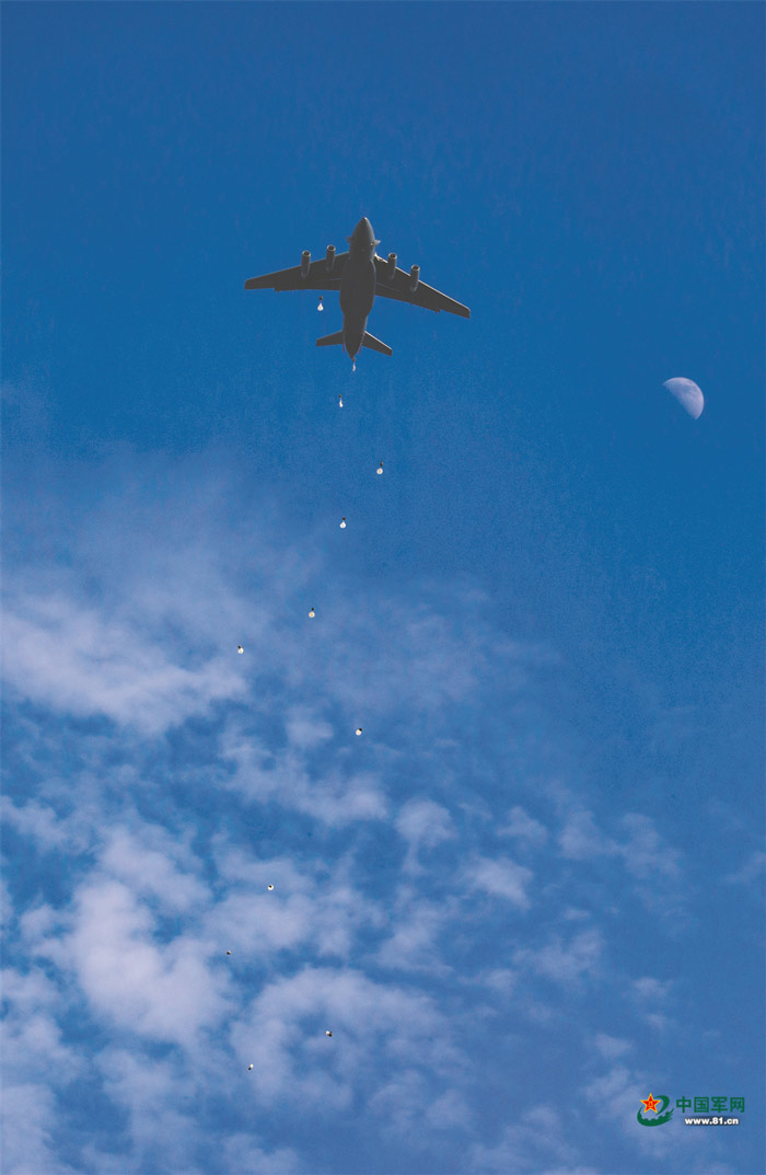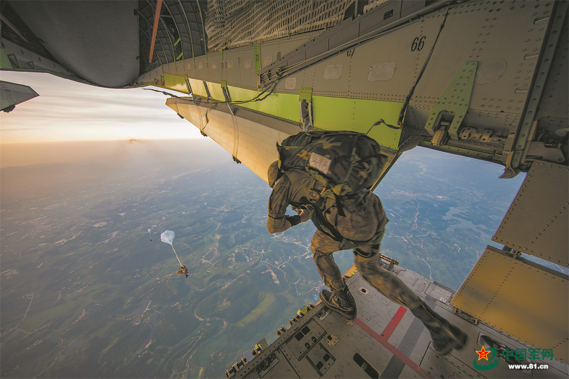 A special operations soldier assigned to the "Thunder" Commando of the PLA Air Force airborne troops jumps out of the aircraft during a parachuting training exercise in mid-summer, 2022. The exercise, lasting for several days, aims to hone the troops' combat capabilities in parachuting, long-range penetration and precision strike operations in the complex environment. (eng.chinamil.com.cn/Photo by Gu Xixi, Xu Jiawang and Guo Shuai)