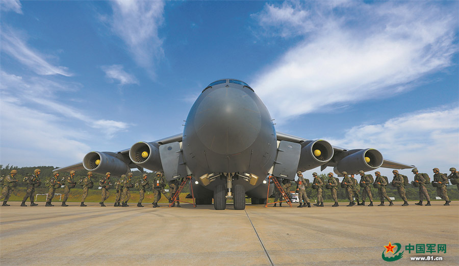 Special operations soldiers assigned to the "Thunder" Commando of the PLA Air Force airborne troops line up to board the aircraft during a parachuting training exercise in mid-summer, 2022. The exercise, lasting for several days, aims to hone the troops' combat capabilities in parachuting, long-range penetration and precision strike operations in complex environment. (eng.chinamil.com.cn/Photo by Gu Xixi, Xu Jiawang and Guo Shuai)