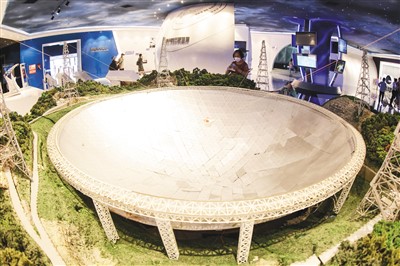 A visitor looks at a model of the FAST (Five-hundred-meter Aperture Spherical Radio Telescope) at a planetarium in Kedu township of Pingtang county, southwest China’s Guizhou Province. (Xinhua/Ou Dongqu)