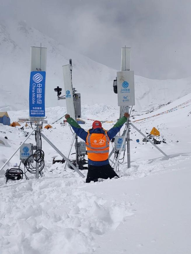 Chinese telecommunication carrier China Mobile builds a 5G station at an altitude of 6,500 meters on Mount Qomolangma, southwest China's Tibet autonomous region, April 2020. It is the world's highest 5G base station. (Photo courtesy of China Mobile)