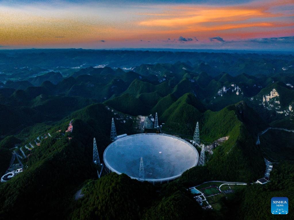 Aerial photo taken on July 21, 2022 shows China's Five-hundred-meter Aperture Spherical Radio Telescope (FAST) under maintenance at sunset in southwest China's Guizhou Province. Located in a naturally deep and round karst depression in southwest China's Guizhou Province, FAST started formal operation in January 2020 and officially opened to the world on March 31, 2021. It is believed to be the world's most sensitive radio telescope. With FAST, scientists have identified over 660 new pulsars. (Xinhua/Ou Dongqu)