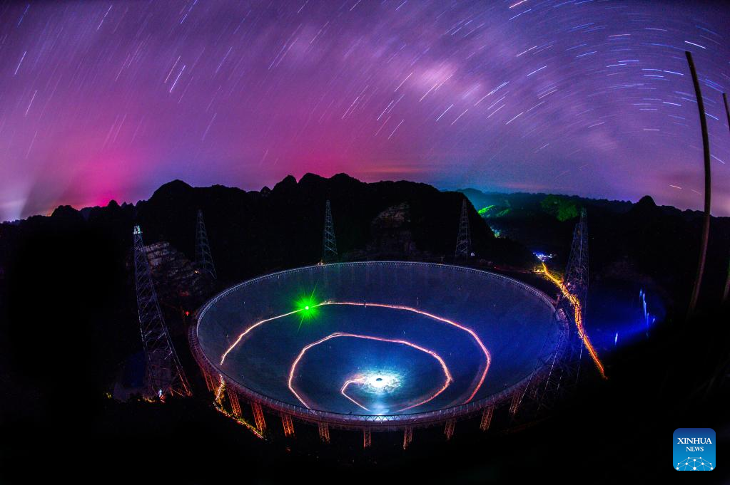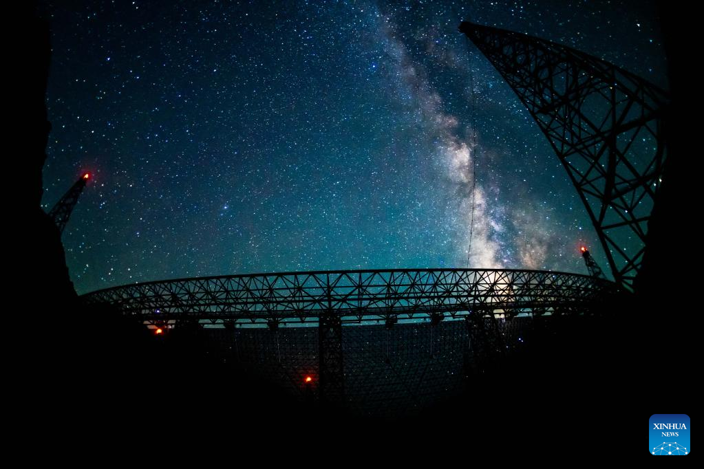 The long-time exposure photo taken on July 25, 2022 shows a night view of China's Five-hundred-meter Aperture Spherical Radio Telescope (FAST) under maintenance in southwest China's Guizhou Province.