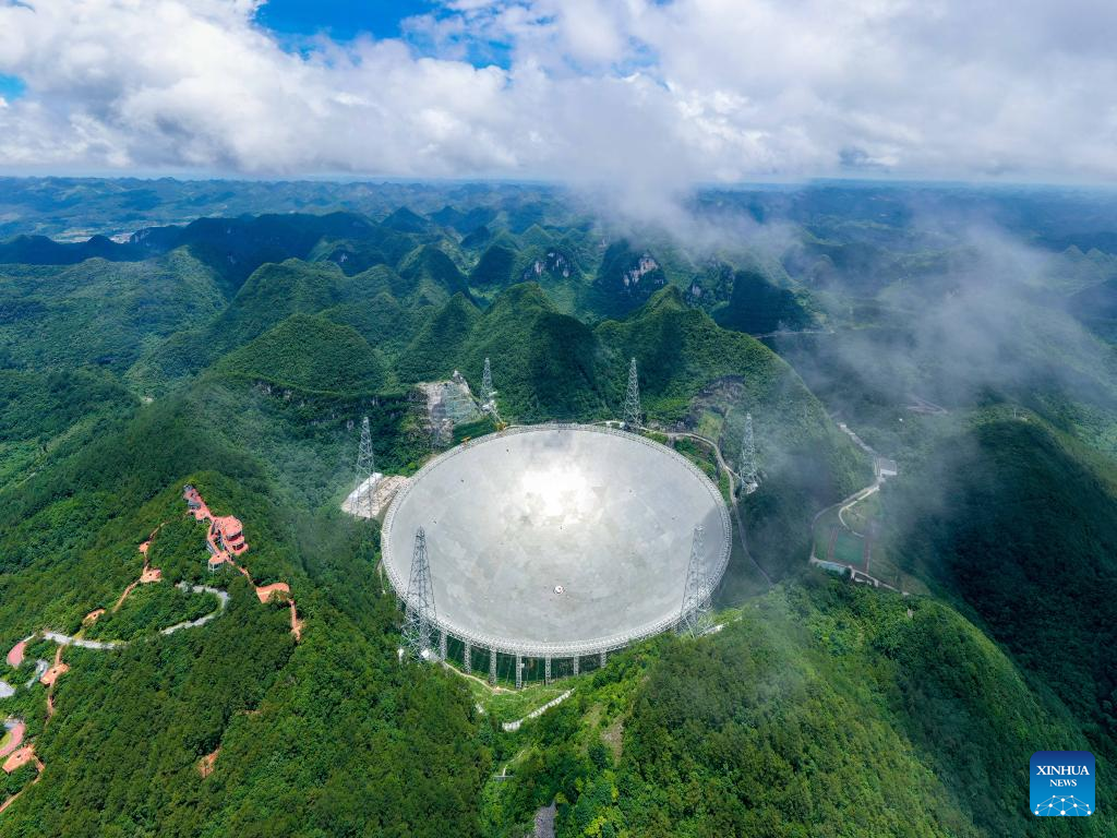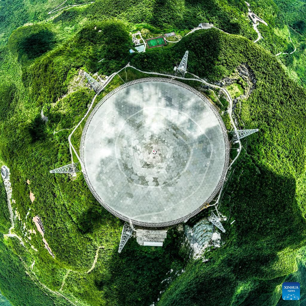 Aerial panoramic photo taken on July 21, 2022 shows China's Five-hundred-meter Aperture Spherical Radio Telescope (FAST) under maintenance in southwest China's Guizhou Province. Located in a naturally deep and round karst depression in southwest China's Guizhou Province, FAST started formal operation in January 2020 and officially opened to the world on March 31, 2021. It is believed to be the world's most sensitive radio telescope. With FAST, scientists have identified over 660 new pulsars. (Xinhua/Ou Dongqu)