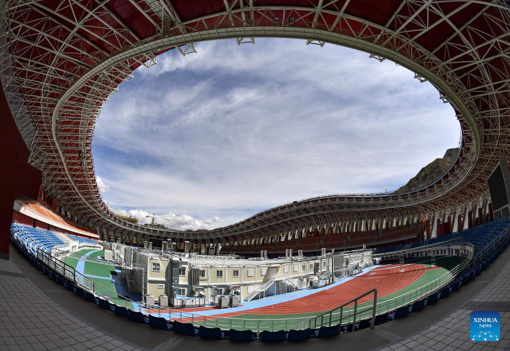 Photo taken on Aug. 9, 2022 shows a makeshift hospital built at a sports center in Lhasa, southwest China's Tibet Autonomous Region. Tibet Autonomous Region has built three makeshift hospitals in the cities of Lhasa, Xigaze and Qamdo to accommodate asymptomatic carriers of COVID-19 and those with mild symptoms. (Xinhua/Jigme Dorje)