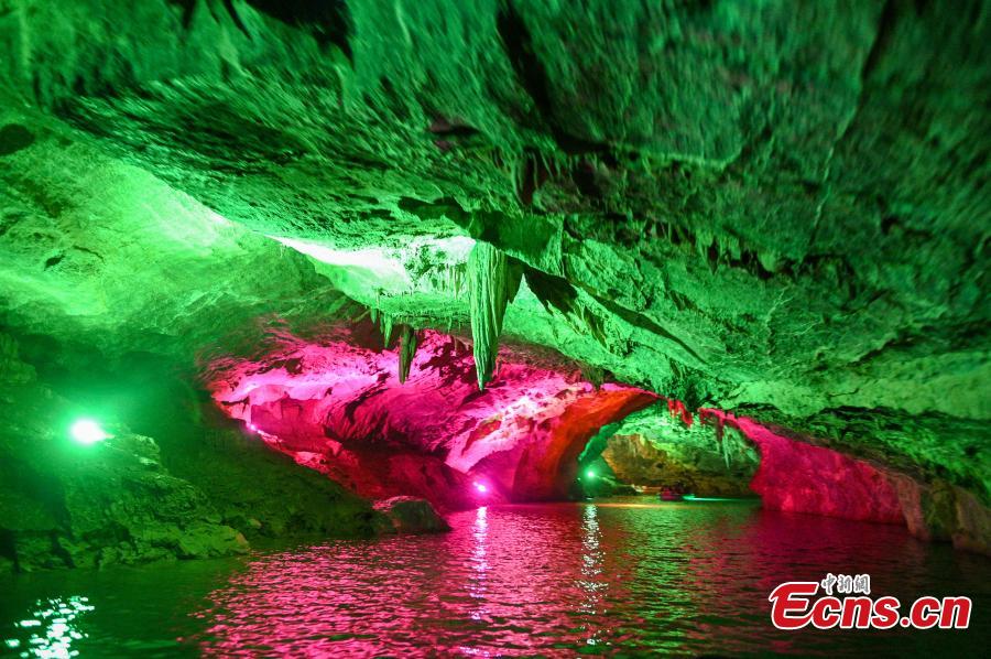 Colored lights illuminate the geological formations at the Benxi Water Cave, a large-scale underground karst, in Benxi, northeast China's Liaoning Province, Aug. 10, 2022. (Photo: China News Service/Yu Haiyang)
