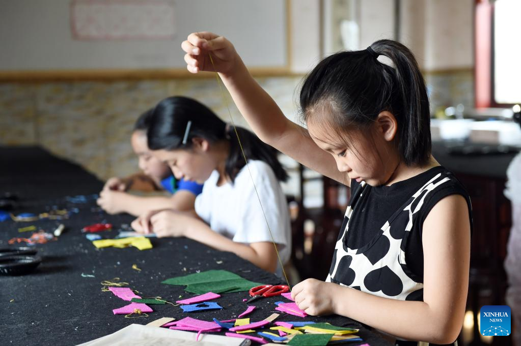 Students learn embroidery in Hefei, east China's Anhui Province, Aug. 10, 2022.