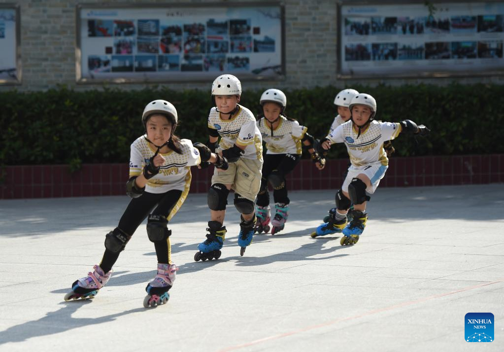 Students learn roller skating in Hefei, east China's Anhui Province, Aug. 10, 2022.