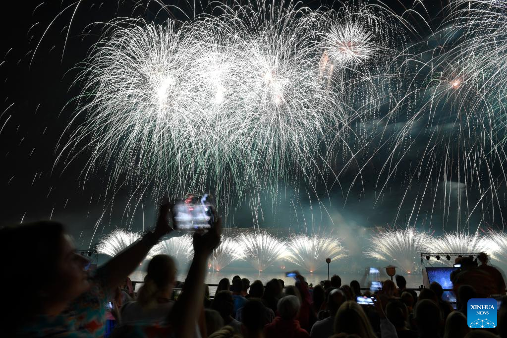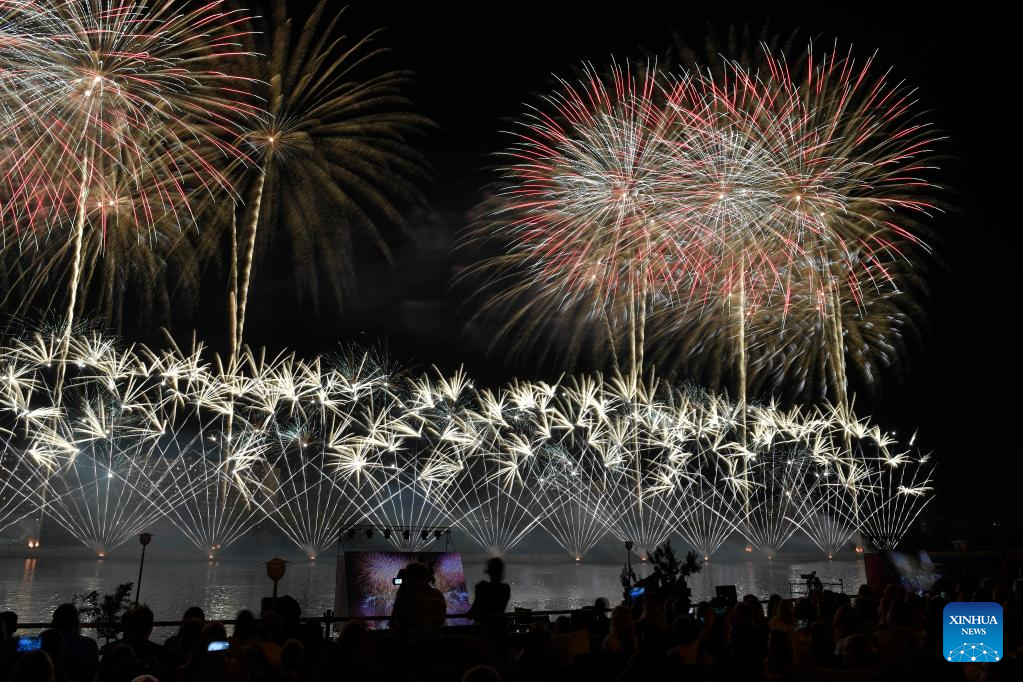 People watch fireworks during the Rostec fireworks festival in Moscow, Russia, on Aug. 14, 2022. (Photo by Alexander Zemlianichenko Jr/Xinhua)