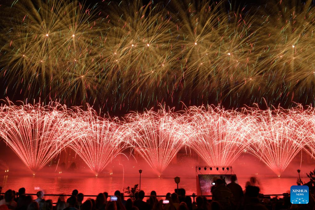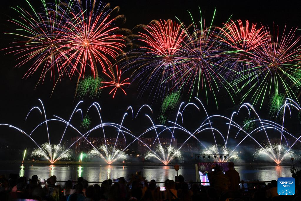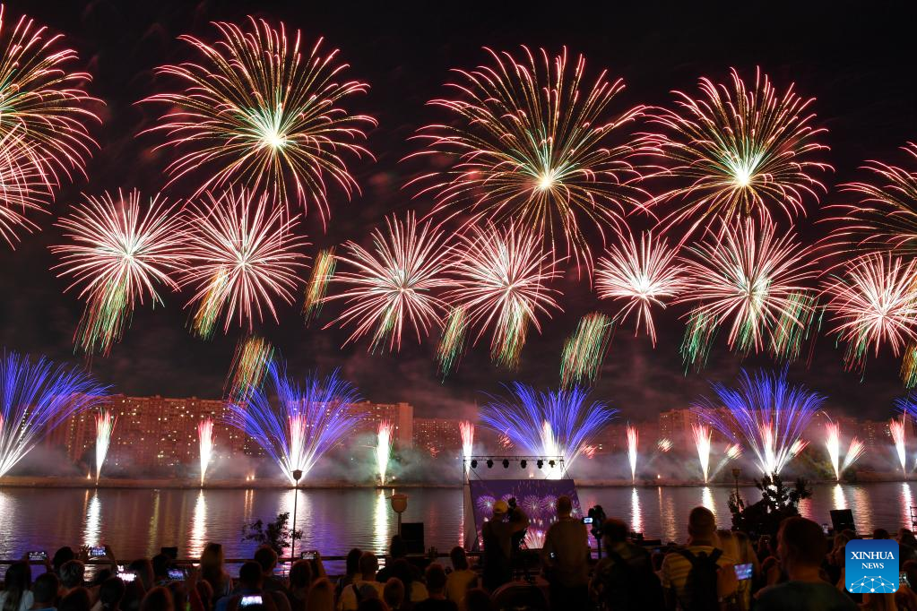 Fireworks explode in the sky during the Rostec fireworks festival in Moscow, Russia, Aug. 14, 2022. (Photo by Alexander Zemlianichenko Jr/Xinhua)