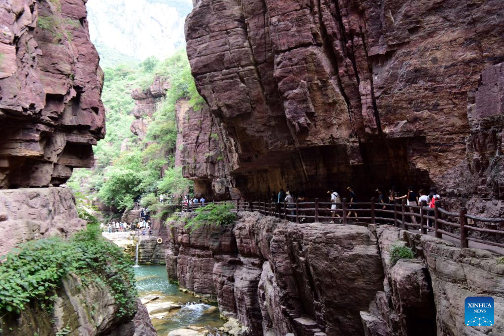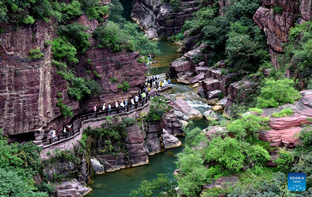 People visit the Yuntai Mountain scenic spot in central China's Henan Province, Aug. 24, 2022. (Xinhua/Lyu Guoqing)
