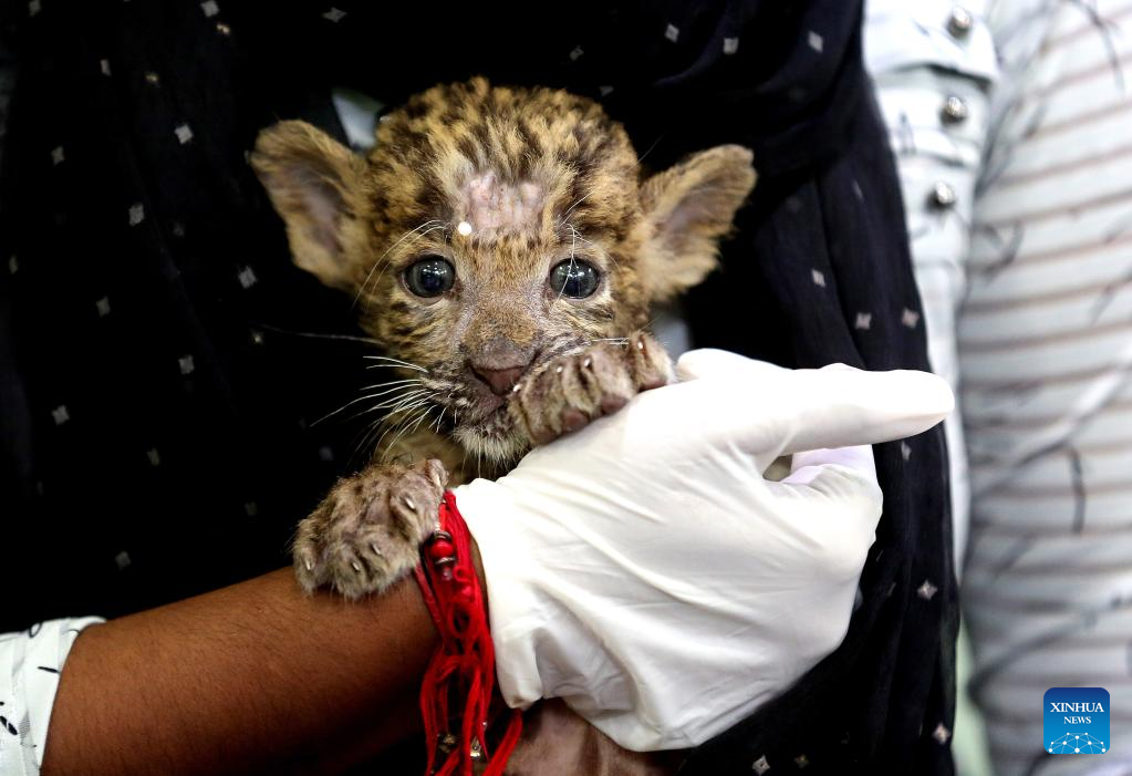 A caretaker holds a one-month-old leopard cub, rescued in the jungle, at Kamla Nehru Zoological Park in Indore, 200 Km from Bhopal, capital of India's Madhya Pradesh state, on Sept. 4, 2022. (Str/Xinhua)
