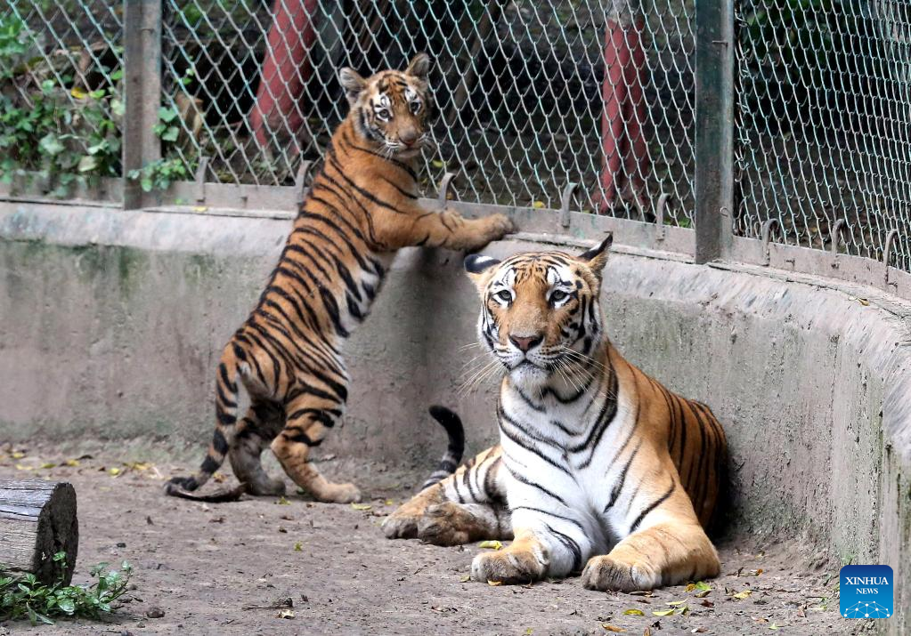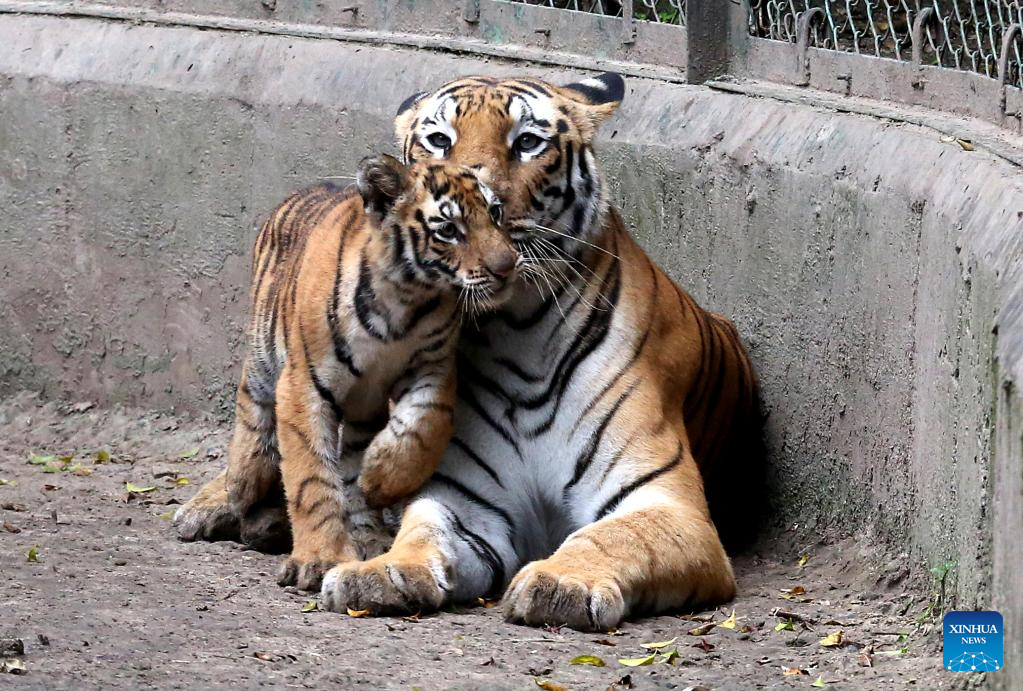 A tigress interacts with her cub at Kamla Nehru Zoological Park in Indore, 200 Km from Bhopal, capital of India's Madhya Pradesh state, on Sept. 4, 2022. (Str/Xinhua)