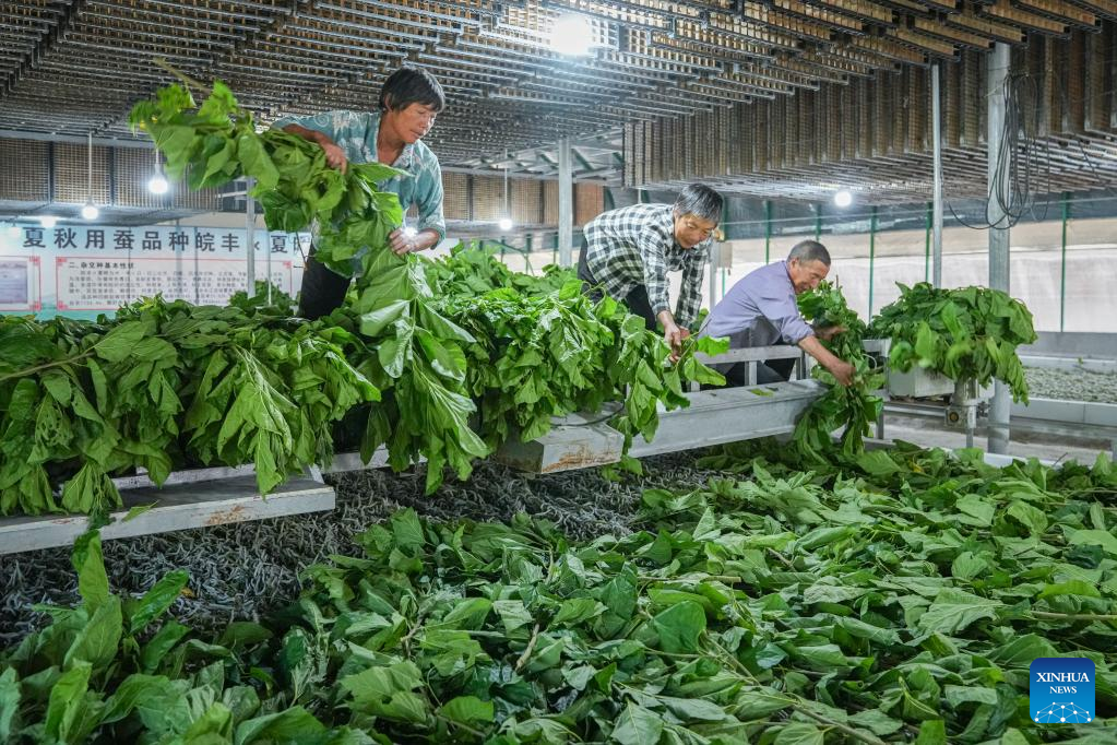 The cultivation of mulberry trees and breeding of silkworms industry is one of the major pillar industries in Yuexi County, east China's Anhui Province. Mulberry trees cover an area of 80,000 mu (about 5,333 hectares) with 16,700 households breeding silkworms in the county. In 2021, silkworm farmers earned 262 million yuan (about 37.79 million U.S. dollars) from selling cocoons.