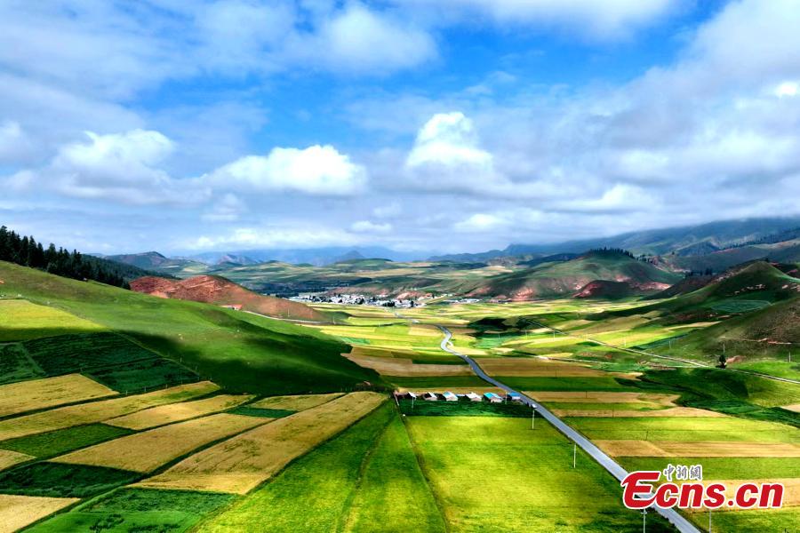 Autumn settles over the Qilian Mountains, Qilian county in Haibei Tibetan autonomous prefecture, Northwest China's Qinghai Province. Golden fields and green grasslands created an unique autumn scenery. (Photo: China News Service/Yang Chunli)