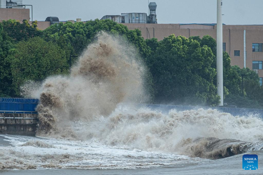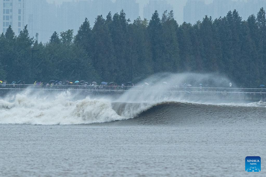 Billows are seen as a tidal bore hits banks of the Qiantang River in Hangzhou, east China's Zhejiang Province, on Sept. 13, 2022. The Qiantang River tidal bore, famous for its height and speed, is a traditional tourist attraction here. (Xinhua/Jiang Han)