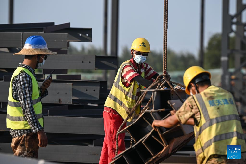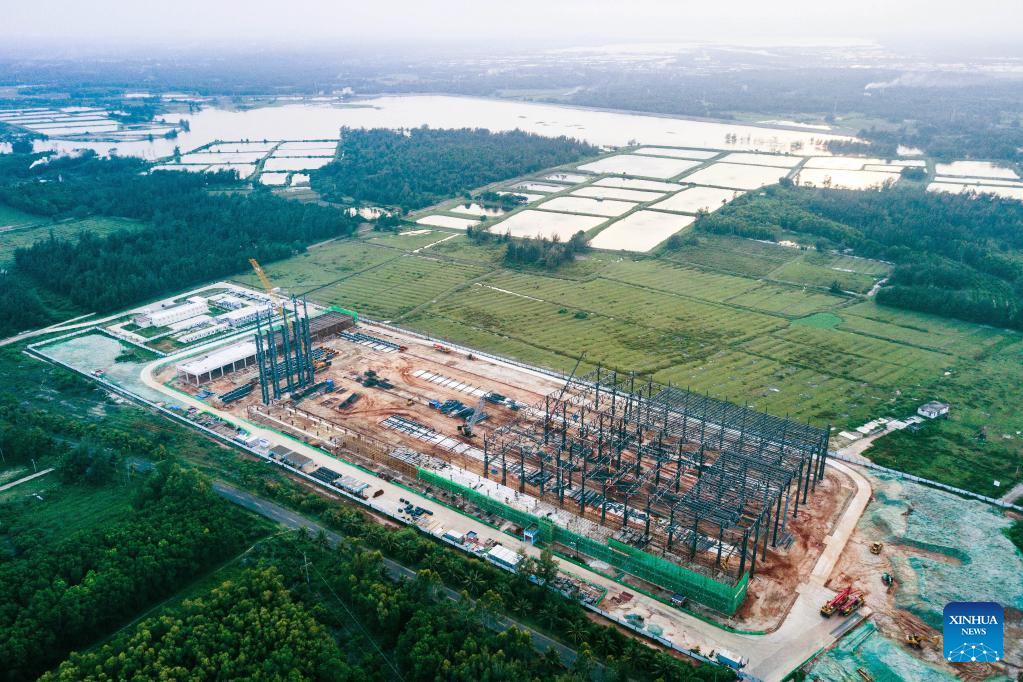 Staff members work at the construction site of the Wenchang International Aerospace City in Wenchang, south China's Hainan Province, Sept. 16, 2022.