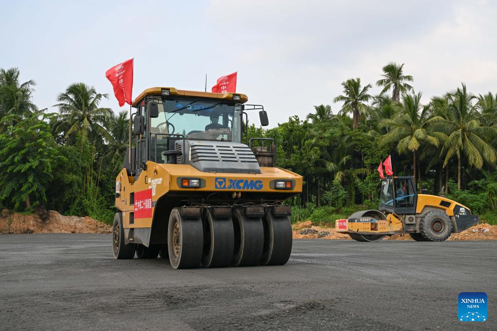 Staff members work at the construction site of the road network at the Wenchang International Aerospace City in Wenchang, south China's Hainan Province, Sept. 14, 2022. Focusing on the development of aerospace science and technology, the Wenchang International Aerospace City, one of the key industrial parks of Hainan free trade port, is undergoing construction in an orderly manner. (Xinhua/Pu Xiaoxu)