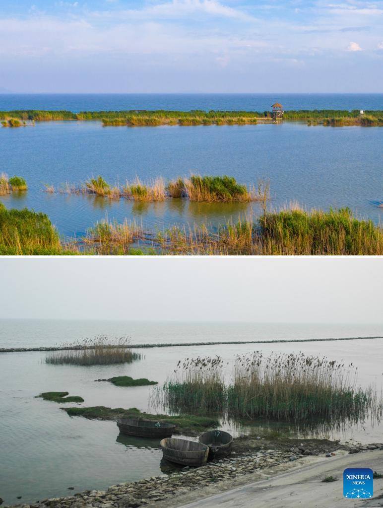 Combo photo shows a view of a wetland around the Chaohu Lake on Sept. 6, 2022 (upper, Xinhua/Liu Junxi) and trees at the bank of the Chaohu Lake in Hefei City, east China's Anhui Province, Feb. 17, 2012 (Photo by He Xibin/Xinhua). As the fifth-largest freshwater lake in China, Chaohu Lake is known as the "kidney" of the Yangtze River.