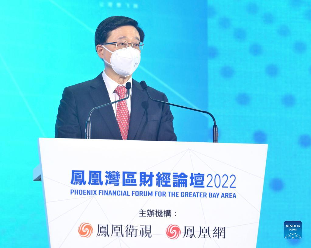 Chief Executive of the Hong Kong Special Administrative Region (HKSAR) John Lee speaks during a financial forum held by Phoenix TV and other institutions in Hong Kong, south China, Sept. 21, 2022. The financial forum opened here Wednesday online and offline, with government officials, industry leaders and scholars discussing opportunities in the Guangdong-Hong Kong-Macao Greater Bay Area (GBA). (Xinhua)