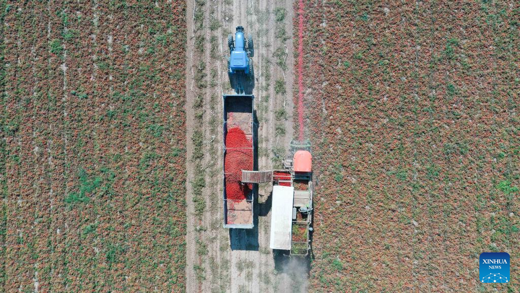 Aerial photo shows villagers havesting tomatoes in Xingfu Village of Changji, northwest China's Xinjiang Uygur Autonomous Region, Sept. 19, 2022. (Photo by Feng Guofeng/Xinhua)