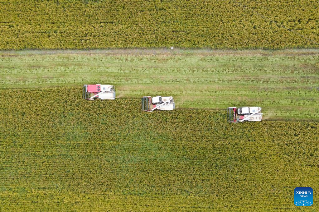 Aerial photo taken on Sept. 21, 2022 shows harvesters working in a paddy field in Xinhua Village of Chongzhou, southwest China's Sichuan Province. (Xinhua/Xu Bingjie)
