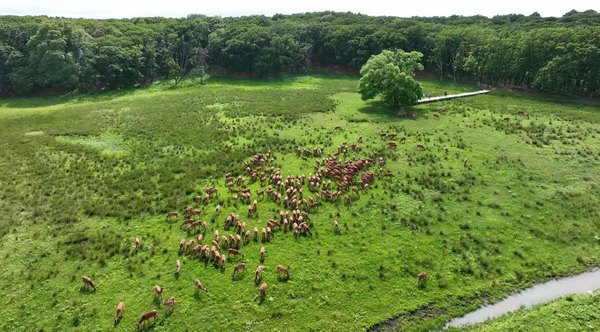 A herd of Xingkai Lake sika deer forage at a meadow on the bank of Xingkai Lake in Mishan city, northeast China's Heilongjiang Province. (Heilongjiang Daily/Zhang Chunlei)
