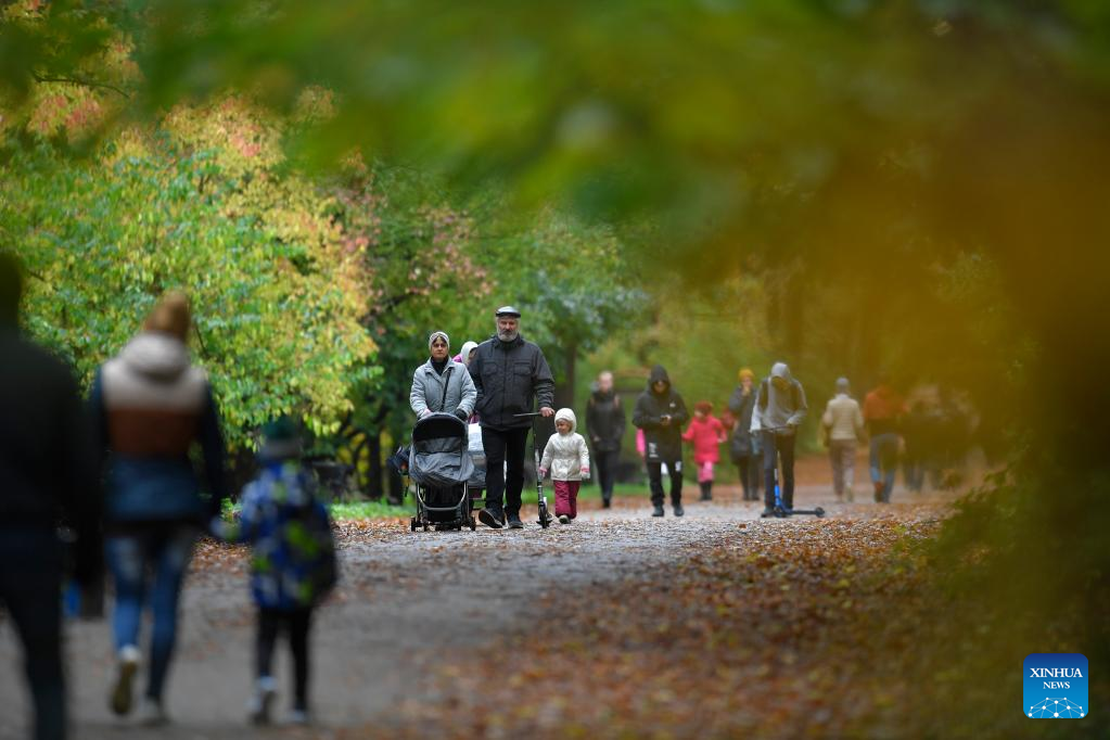 People walk at a park in Moscow, Russia, on Sept. 25, 2022. (Photo by Alexander Zemlianichenko Jr/Xinhua)