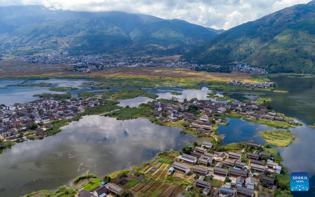 Aerial photo taken on Sept. 28, 2022 shows the scenery of Eryuan West Lake in Eryuan County of Dali Bai Autonomous Prefecture, southwest China's Yunnan Province. (Xinhua/Chen Xinbo)