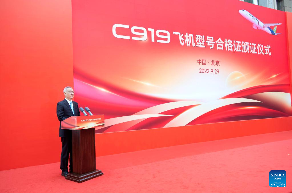 Chinese Vice Premier Liu He, also a member of the Political Bureau of the Communist Party of China Central Committee, addresses the type certificate conferring ceremony for the C919, China's first homegrown large jetliner, at the Beijing Capital International Airport in Beijing, capital of China, Sept. 29, 2022. (Xinhua/Li Tao)