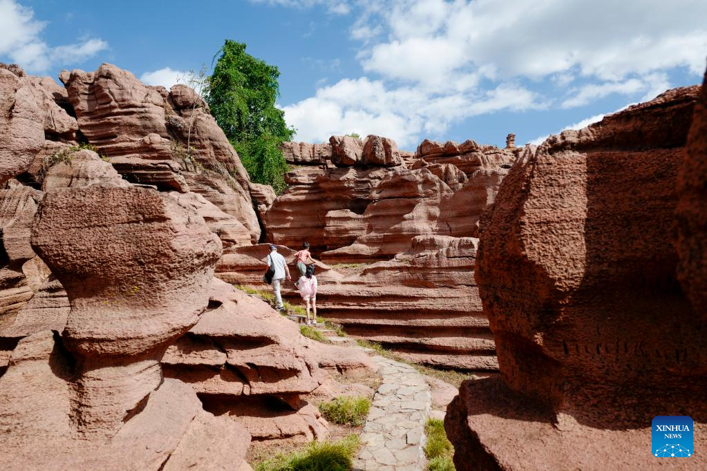 Tourists visit a red stone forest geopark in Youyang Tujia and Miao Autonomous County, southwest China's Chongqing Municipality, Oct. 3, 2022. The Youyang red stone forest geopark, which has the karst landform, opened to the public during the National Day holiday. (Xinhua/Liu Chan)