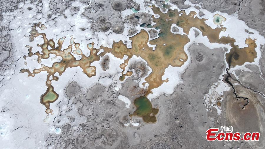 Drone photo shows the natural landscape of the Gaskule Lake in Mangya city, northwest China's Qinghai Province. The brine overflows to the salt flat, looking like an ink painting. (Photo: China News Service/Tang Tuohua)