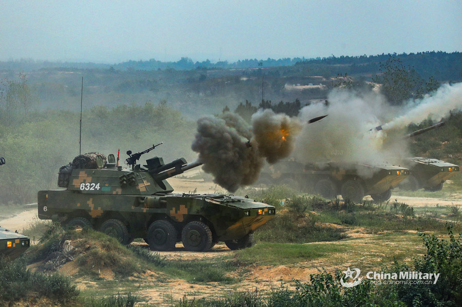A line of self-propelled howitzer systems attached to a brigade under the PLA 71st Group Army open fire during a live-fire training exercise on Sept. 26, 2022. (eng.chinamil.com.cn/Photo by Liu Renhao)