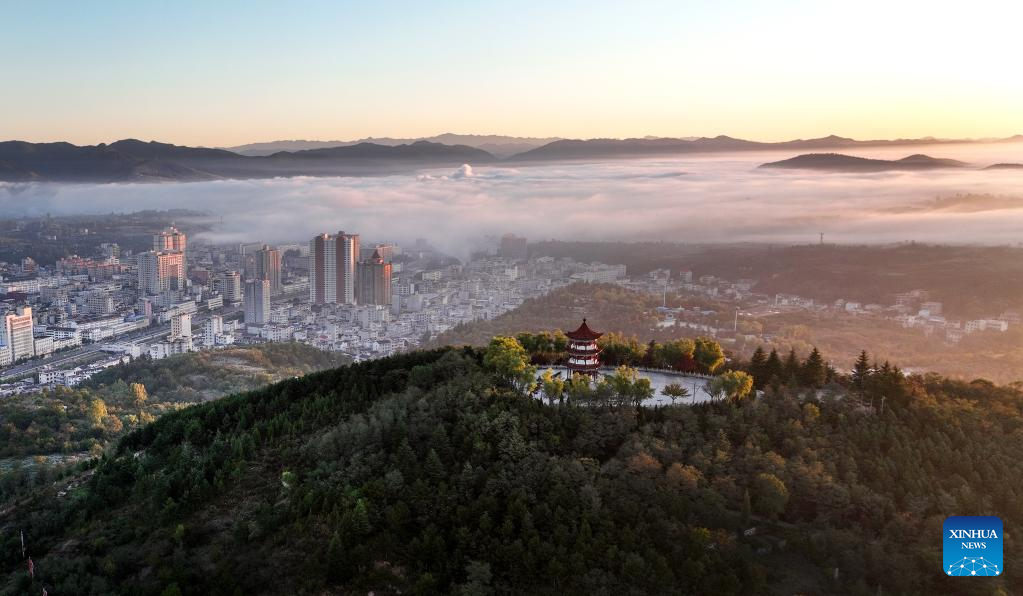 Aerial photo taken on Oct. 11, 2022 shows the Luonan County in the morning light in northwest China's Shaanxi Province. (Xinhua/Tao Ming)