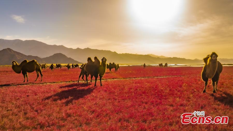 Camels forage at Dulan Lake National Wetland Park in Qaidam Basin, northwest China's Qinghai Province. A large field of forage grass grows on the wetland in the park, turning it scarlet. (Photo: China News Service/Ma Xiang)