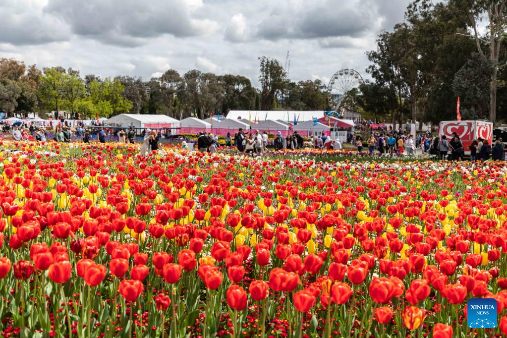 Photo taken on Oct. 16, 2022 shows people attending the Floriade flower festival at the Commonwealth Park in Canberra, Australia. Floriade, one of the Australian Capital Territory's signature events, was held here from Sept. 17 to Oct. 16. (Photo by Chu Chen/Xinhua)