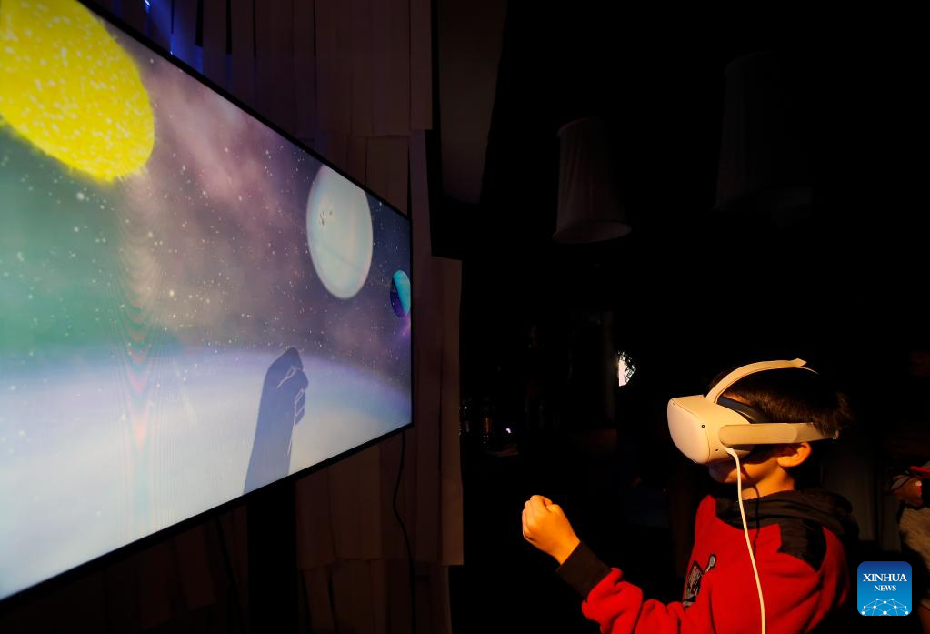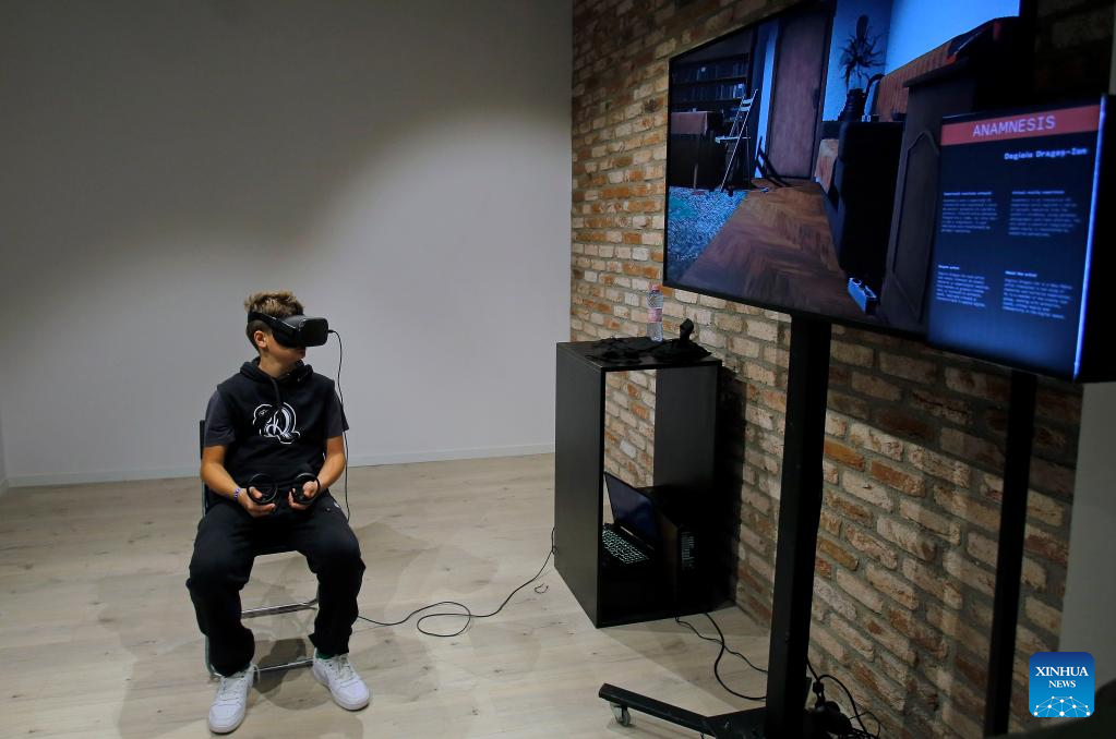 A boy experiences virtual reality goggles while visiting the 3rd edition of the new media art festival RADAR in Bucharest, capital of Romania, Oct. 16, 2022. (Photo by Cristian Cristel/Xinhua)