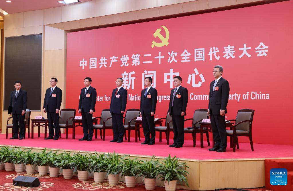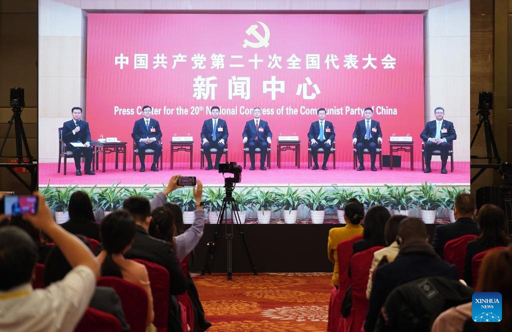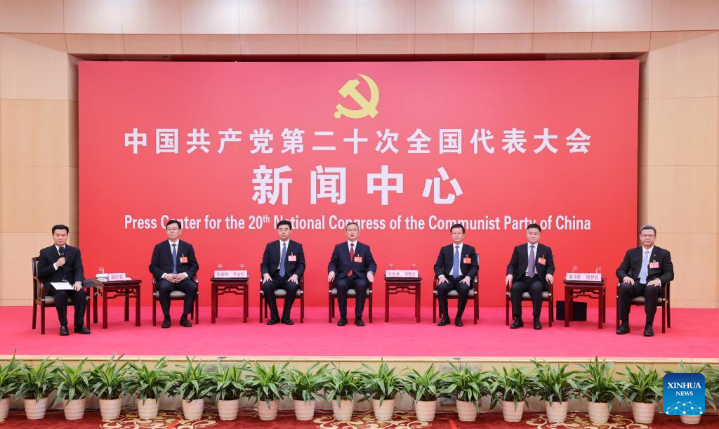 The spokespersons for the delegations from Qinghai, Ningxia, Xinjiang, the central Party and state organs, central financial institutions and central enterprises (in Beijing) to the 20th National Congress of the Communist Party of China (CPC) meet the press during a group interview in Beijing, capital of China, Oct. 20, 2022. The press center for the 20th CPC National Congress hosted its fifth group interview on Thursday. During the interview, the spokespersons introduced the delegations' study and discussion on the report to the 20th CPC National Congress, and answered questions from journalists. (Xinhua/Zhang Yuwei)