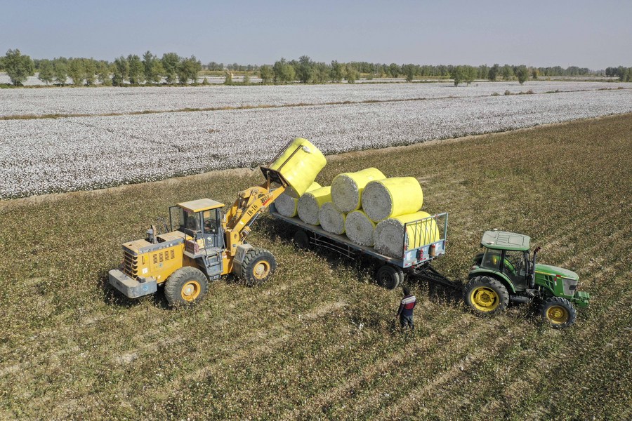 This aerial photo taken on Oct. 14, 2022 shows a vehicle loading cotton bales onto another vehicle in Xingping Township of Yuli County, northwest China's Xinjiang Uygur Autonomous Region. (Photo by Wang Zhipeng/Xinhua)